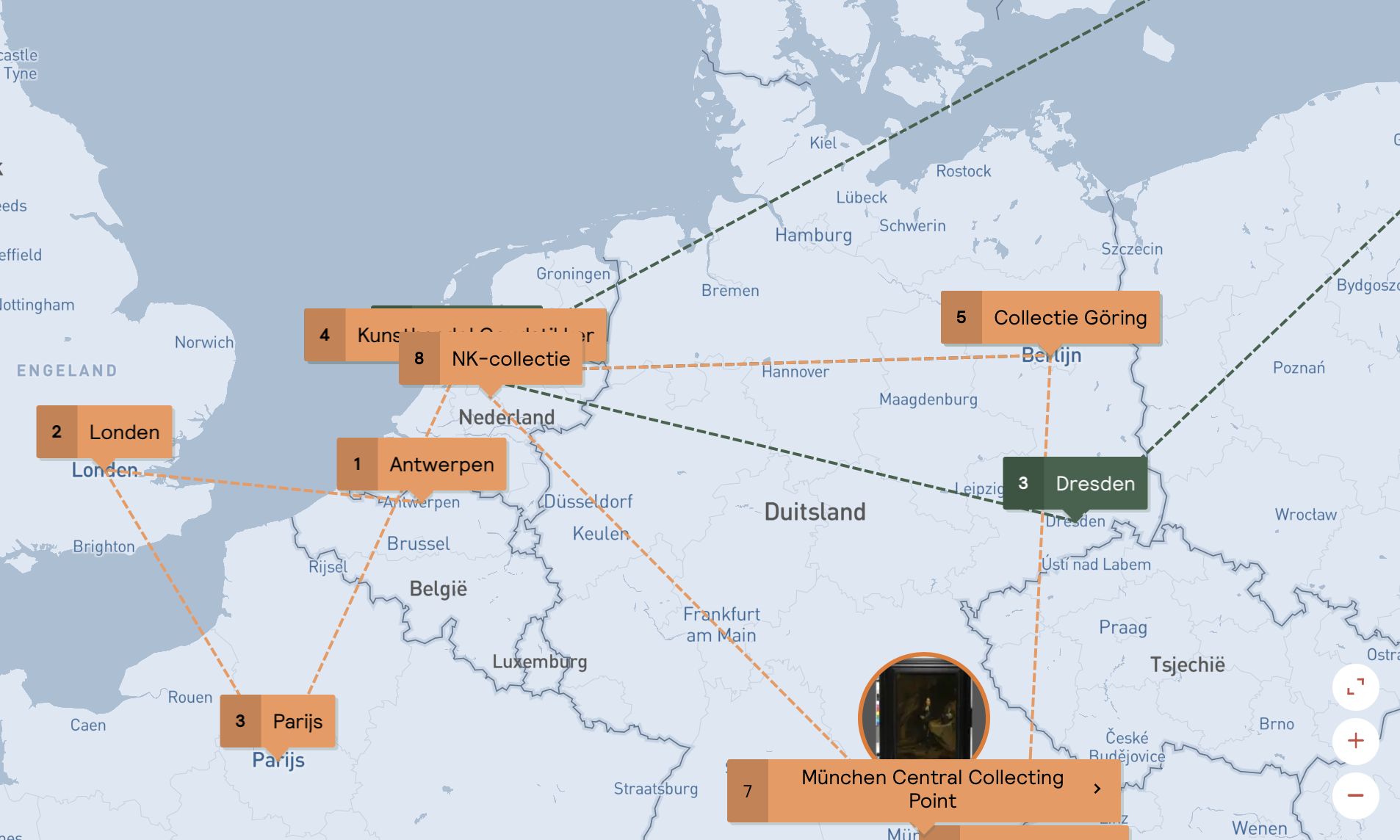 Infographics vertalen complexe en omvangrijke data naar heldere grafieken, waardoor zichtbaar wordt hoe groot de schaal van het bezitsverlies was en hoe het proces zich in de tijd ontwikkelde. Speciaal gemaaktekaarten brengen daarnaast de ruimtelijke dimensie in beeld. Zij laten zien welke routes kunstwerken hebben afgelegd en hoe verspreid collecties konden raken. Daarnaast zijn persoonspagina’s aangevuld met informatie over het verlies van eigendom.